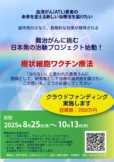 - 血液・細胞治療科が成人T細胞白血病・リンパ腫(ATL)に対する新規治療開発をめざしクラウドファンディングに挑戦しています。
